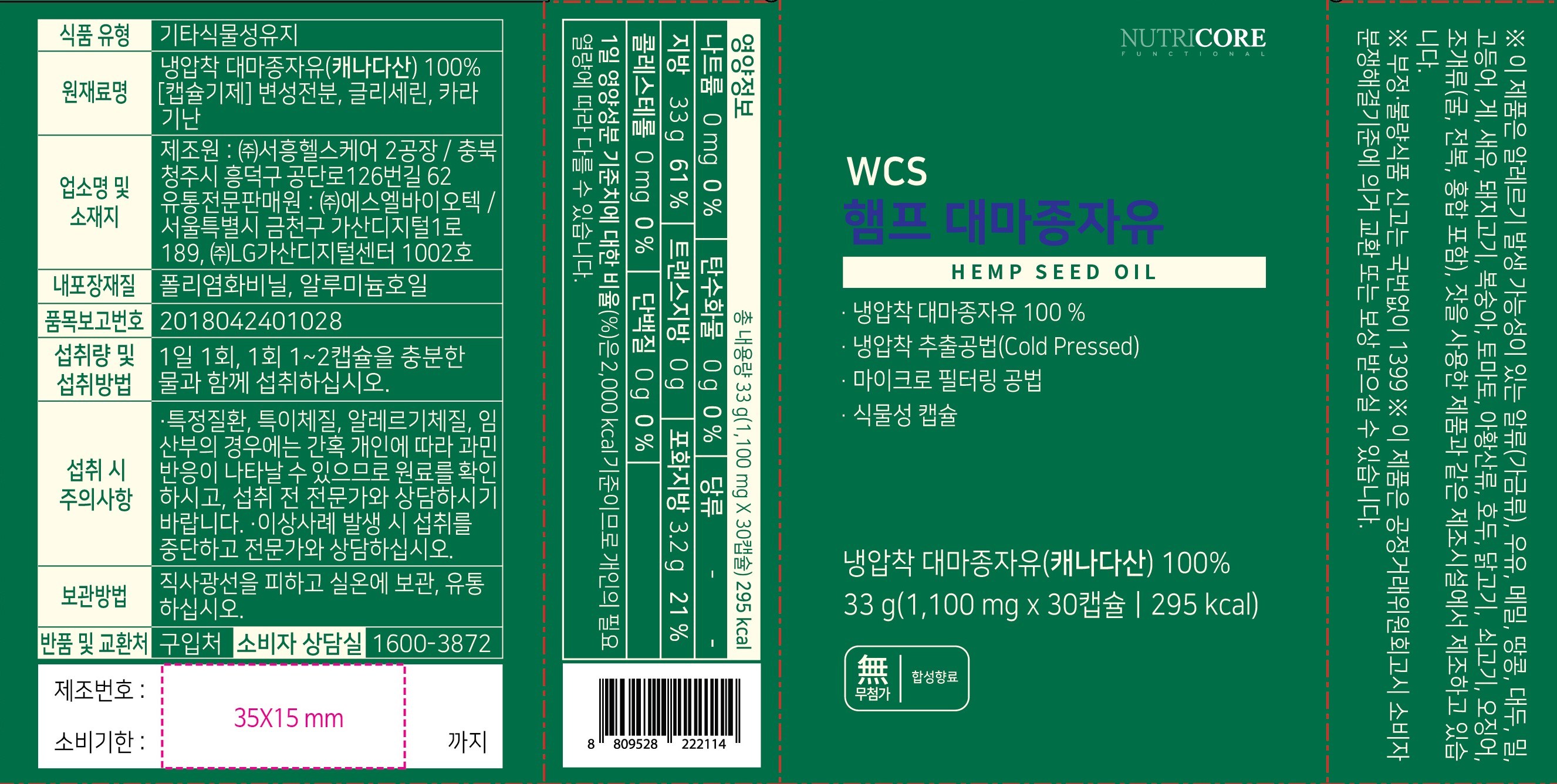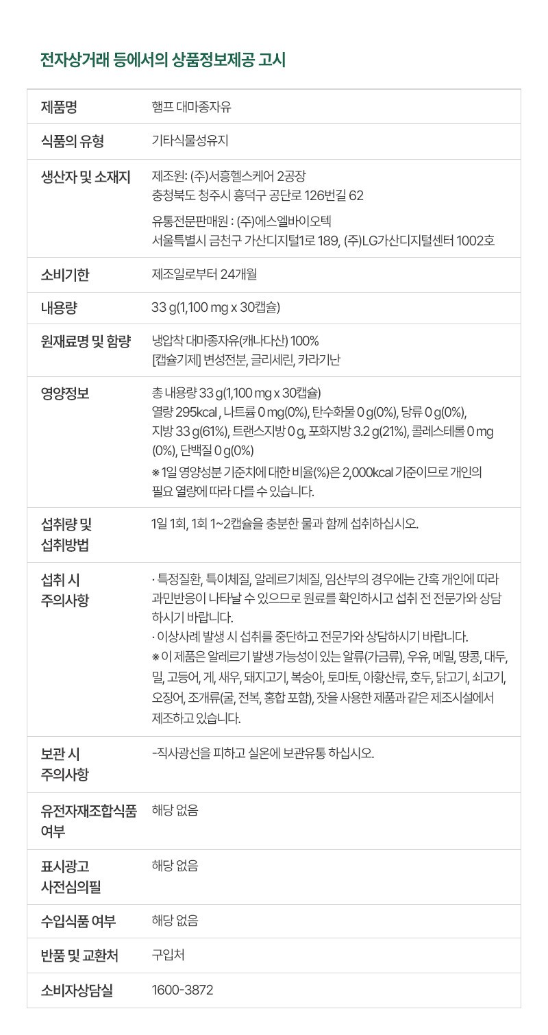 | 제품명 | 햄프 대마종자유 | 식품의 유형 | 컨텐츠 참조 |
