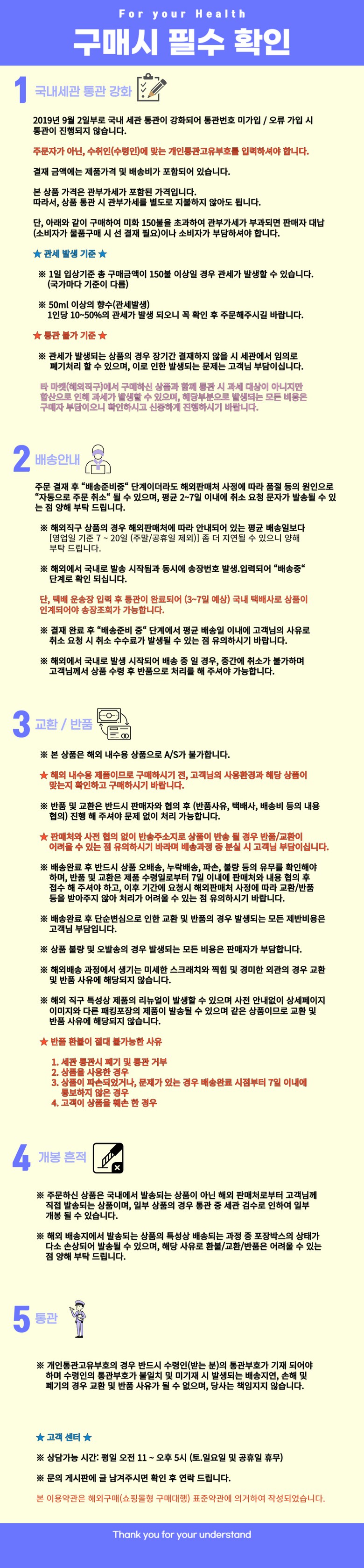 - 주문일 기준 동일 판매자 총 구매 금액이 면세 한도 초과 시 관부가세가 부과될 수 있습니다.