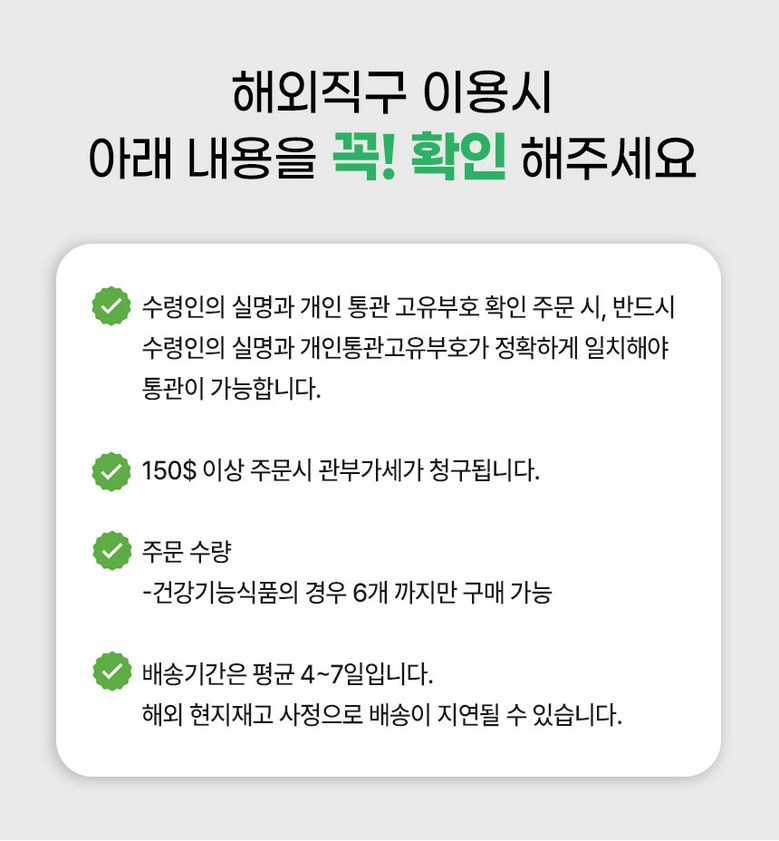 - 주문일 기준 동일 판매자 총 구매 금액이 면세 한도 초과 시 관부가세가 부과될 수 있습니다.