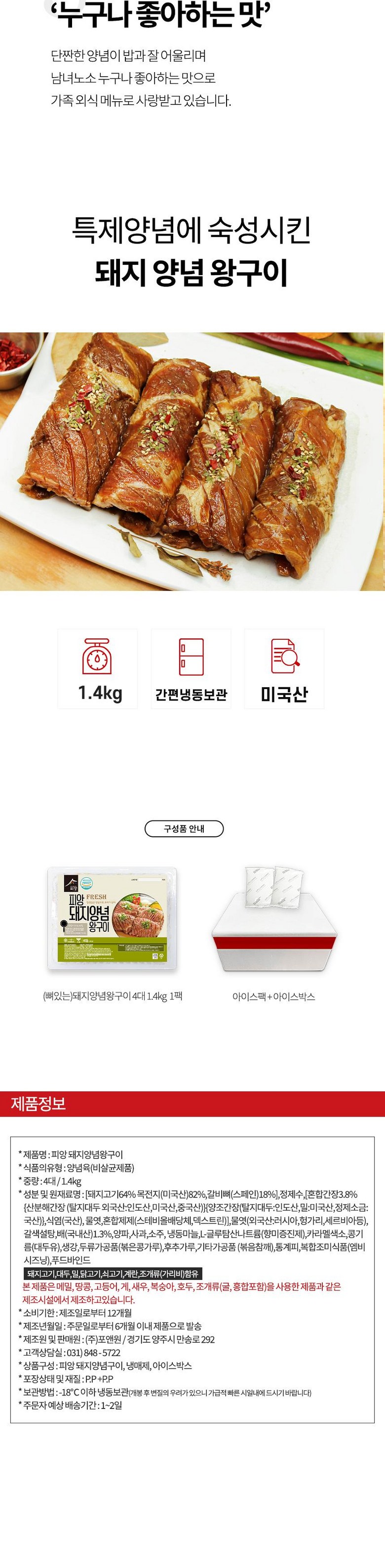| 제품명 | 피앙 돼지양념왕구이 | 식품의 유형 | 양념육 |