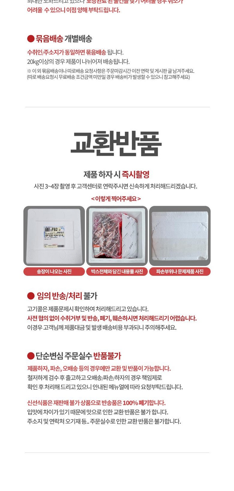 | 계절상품/식품/화장품 | ㆍ신선/냉장/냉동 상품의 단순변심의 경우 ㆍ뷰티 상품 이용 시 트러블(알러지, 붉은 반점, 가려움, 따가움)이 발생하는 경우, |