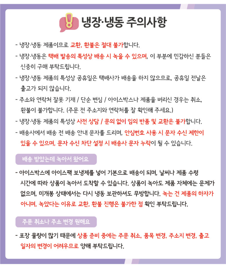 | 계절상품/식품/화장품 | ㆍ신선/냉장/냉동 상품의 단순변심의 경우 ㆍ뷰티 상품 이용 시 트러블(알러지, 붉은 반점, 가려움, 따가움)이 발생하는 경우, |