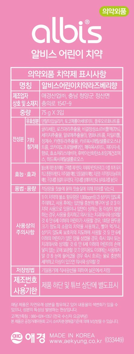 | 품명 및 모델명 | 알비스어린이치약라즈베리향 | 인증/허가 사항 | 의약외품 |