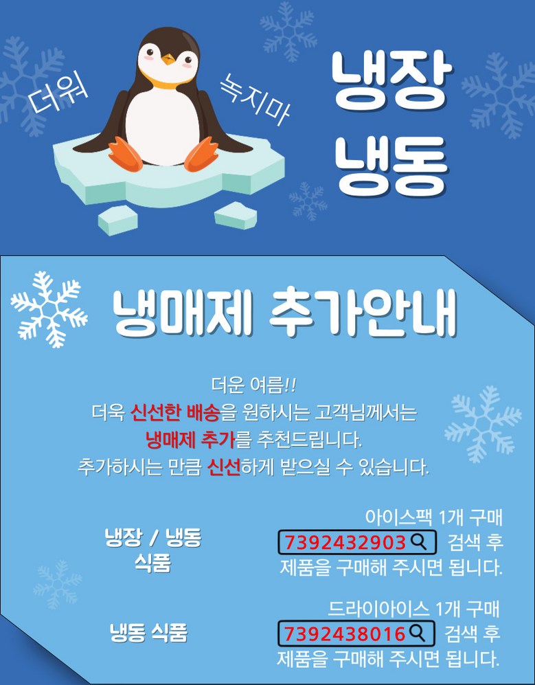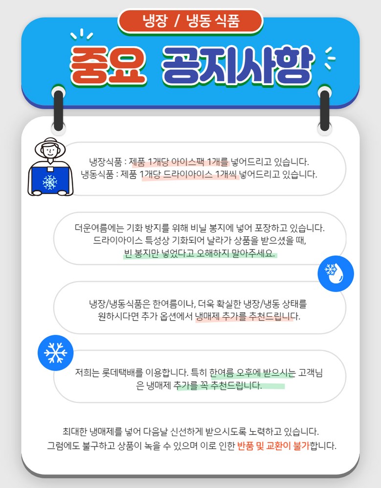 | 배송방법 | 신선/냉장/냉동 | 배송비 | 무료배송 · 도서산간 추가 배송비 - 제주 지역: 4,000원 - 도서산간 지역: 8,000원 |