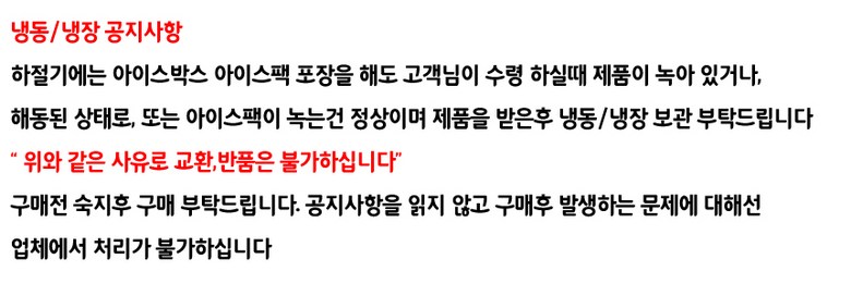 | 배송방법 | 신선/냉장/냉동 | 배송비 | 무료배송 - 도서산간 지역 배송불가 |