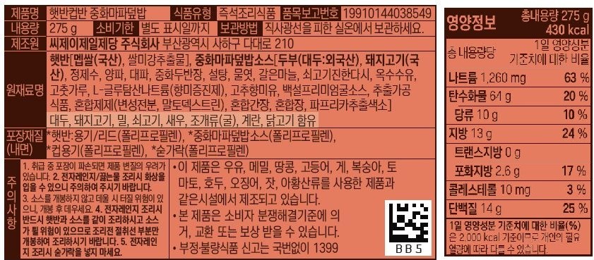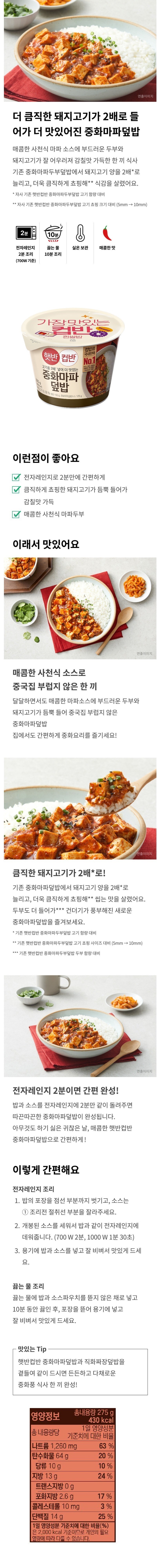 | 제품명 | 햇반컵반 중화마파덮밥 | 식품의 유형 | 컨텐츠 참조 |