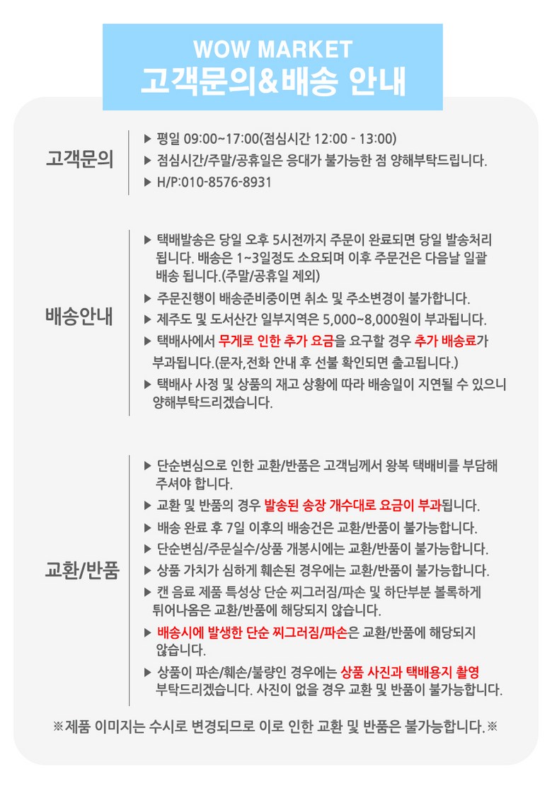 - ㆍ모니터 해상도의 차이로 인해 색상이나 이미지가 실제와 달라, 고객이 단순 변심으로 교환/반품을 무료로 요청하는 경우