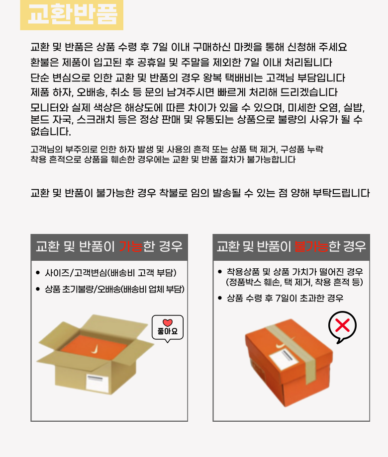 - ㆍ모니터 해상도의 차이로 인해 색상이나 이미지가 실제와 달라, 고객이 단순 변심으로 교환/반품을 무료로 요청하는 경우