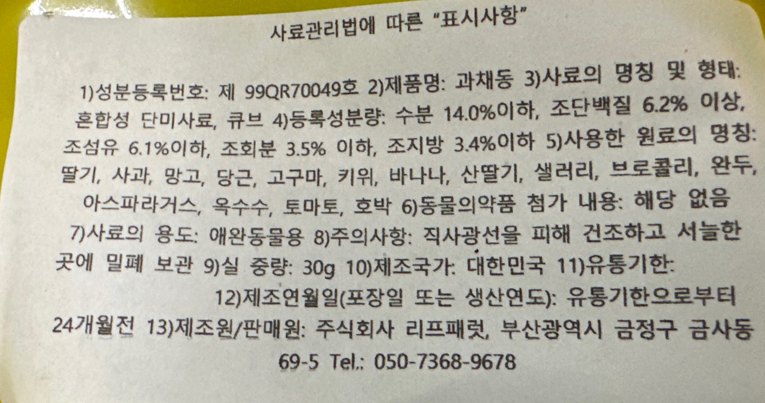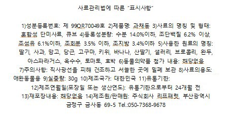 | 품명 및 모델명 | 과채동 | 인증/허가 사항 | 사료관리법에 따른 성분등록번호 : 컨텐츠 참조 |