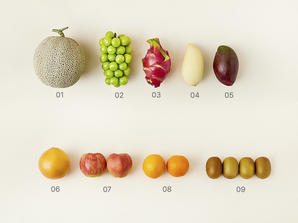 01 멜론 02 샤인머스켓 03 용과 04 망고 05 애플망고 06 자몽 07 사과 2개 08 오렌지 2개 09 골드키위 4개