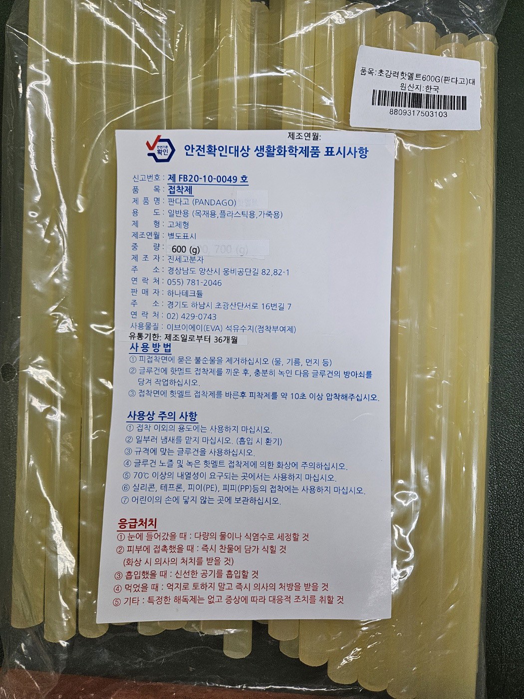 | 품목 및 제품명 | 접착제 / 판다고(PANDAGO) | 용도(표백제의 경우 계열을 함께표시) 및 제형 | 일반용-목재용,일반용-플라스틱용,일반용-가죽용 / 비분사형-고체형 |