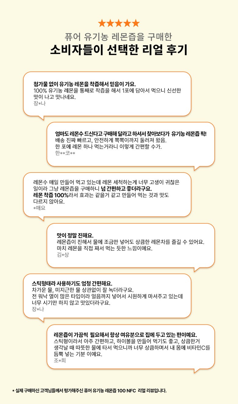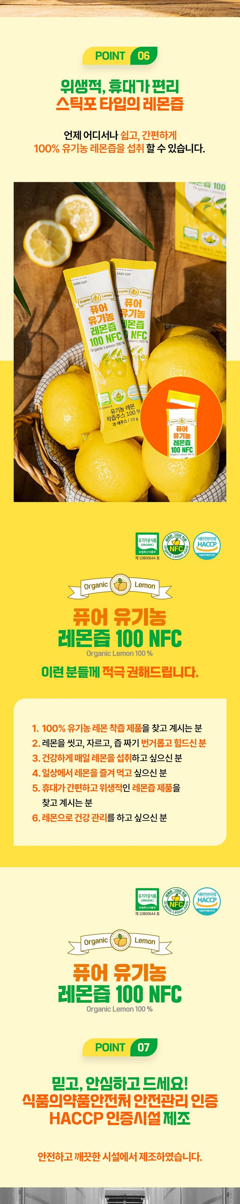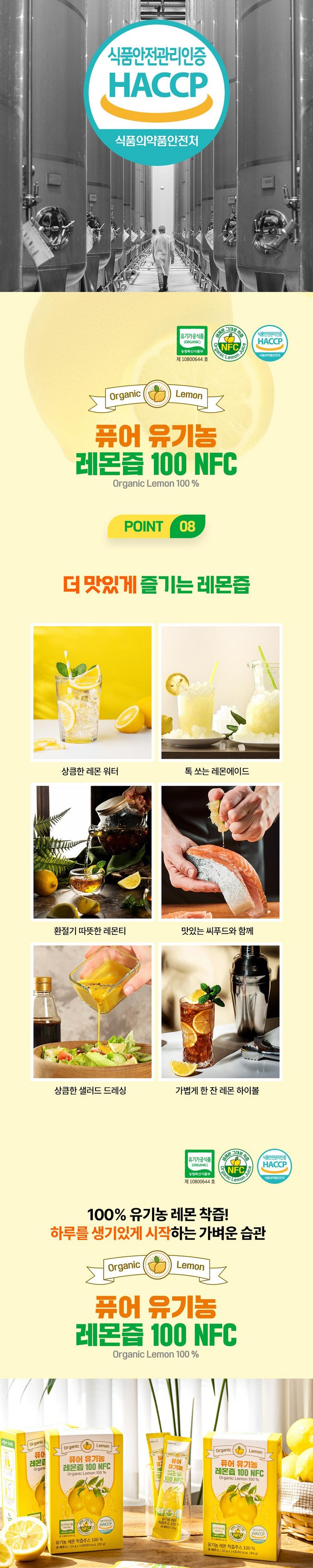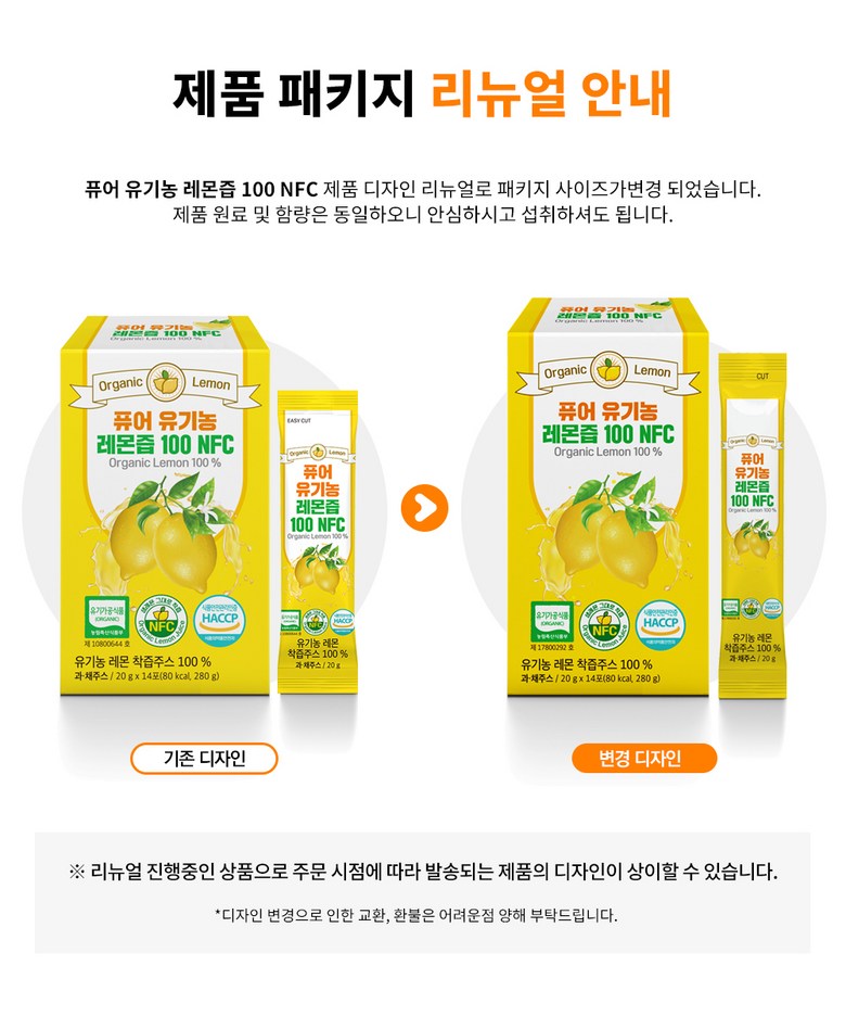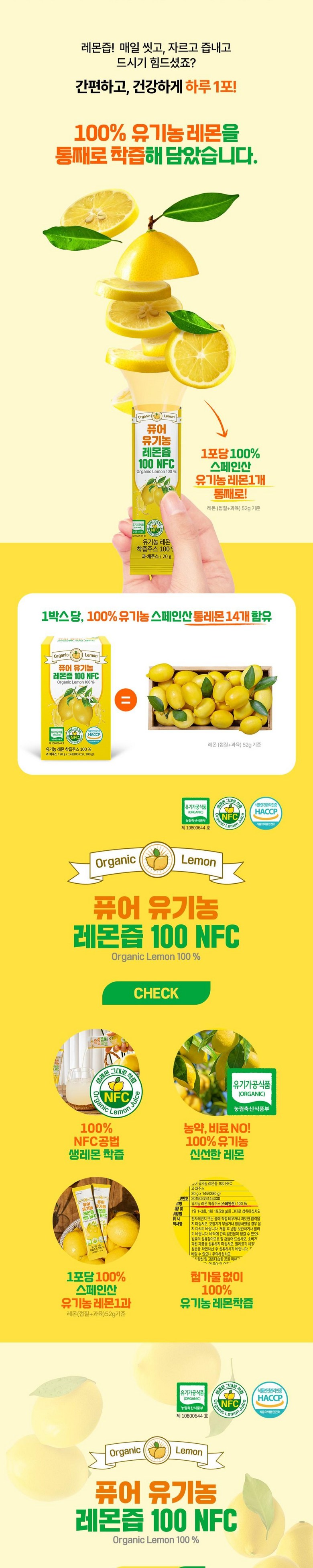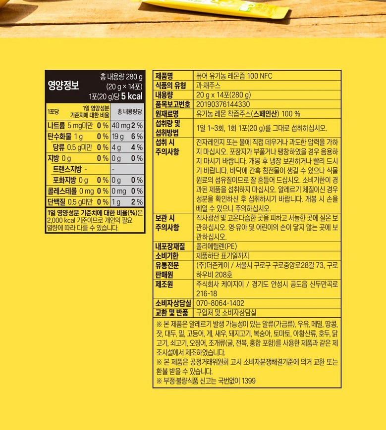 | 제품명 | 퓨어 유기농 레몬즙 100 NFC | 식품의 유형 | 과채주스 |