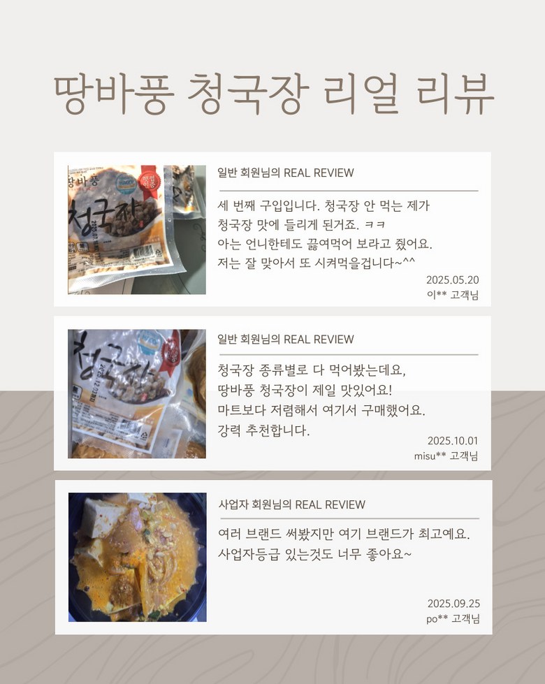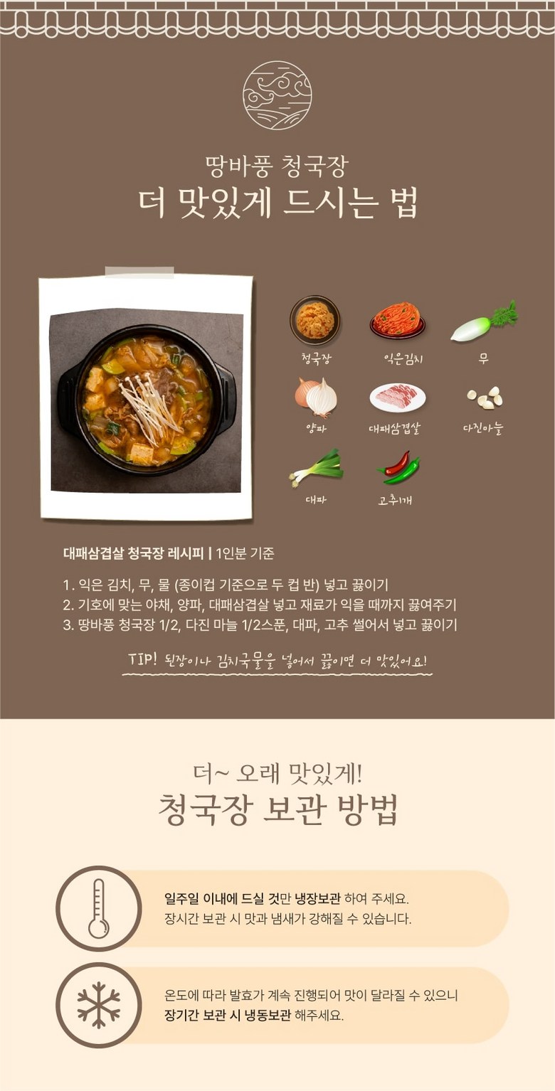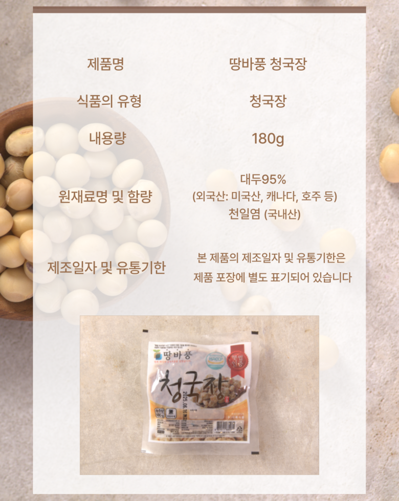 | 제품명 | 땅바풍 햇썹인증 청국장 | 식품의 유형 | 상품 상세페이지 참조 |