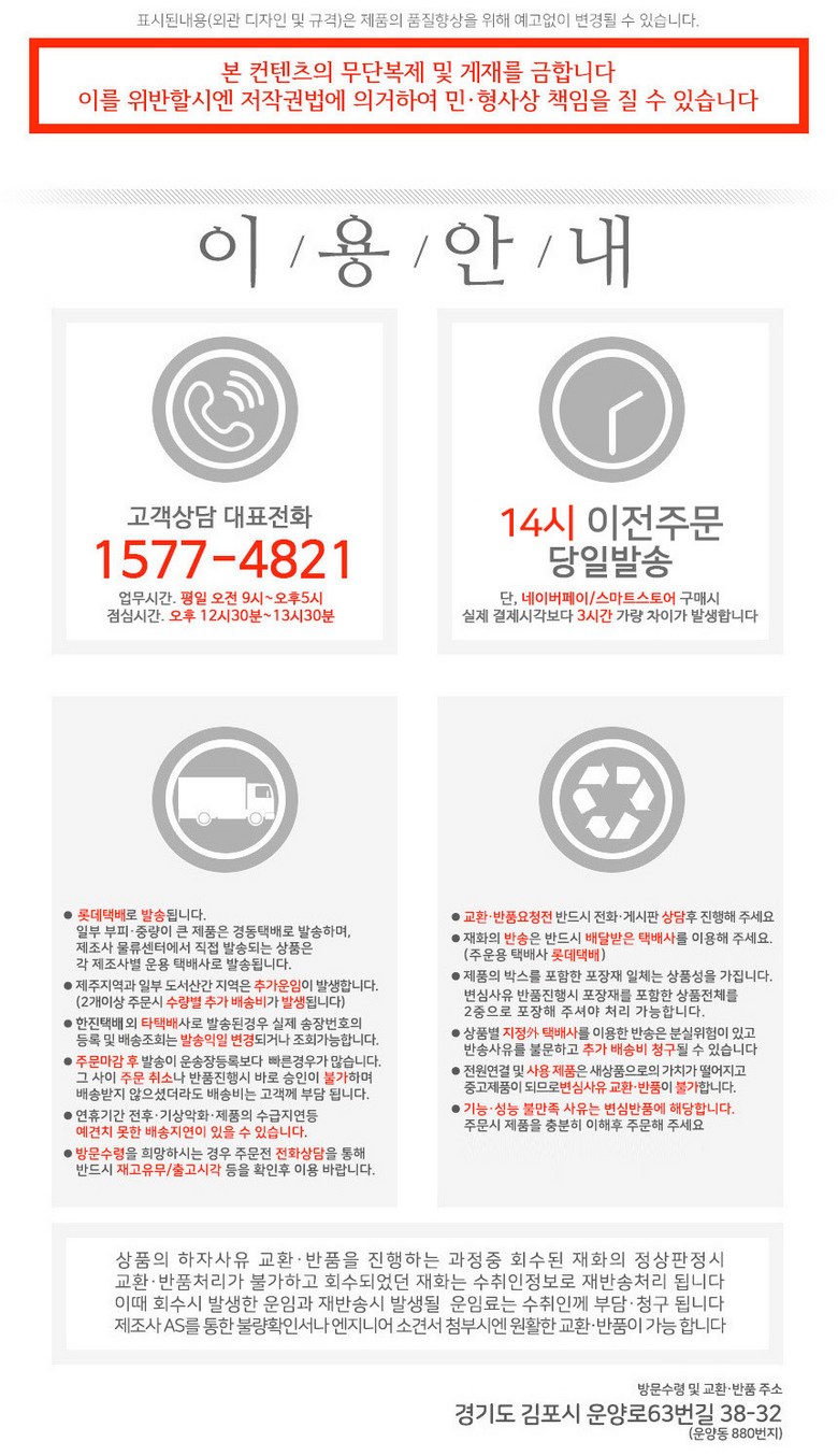 - ㆍ모니터 해상도의 차이로 인해 색상이나 이미지가 실제와 달라, 고객이 단순 변심으로 교환/반품을 무료로 요청하는 경우