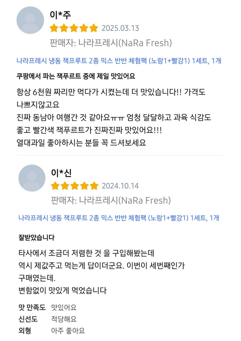 동일한 상품에 대해 작성된 상품 리뷰로, 판매자는 다를 수 있습니다.
