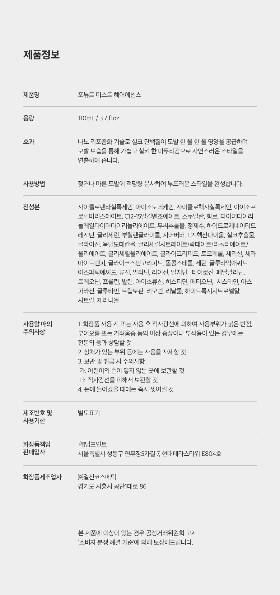 | 용량(중량) | 110ml | 제품 주요 사양 | 모든 모발용 |