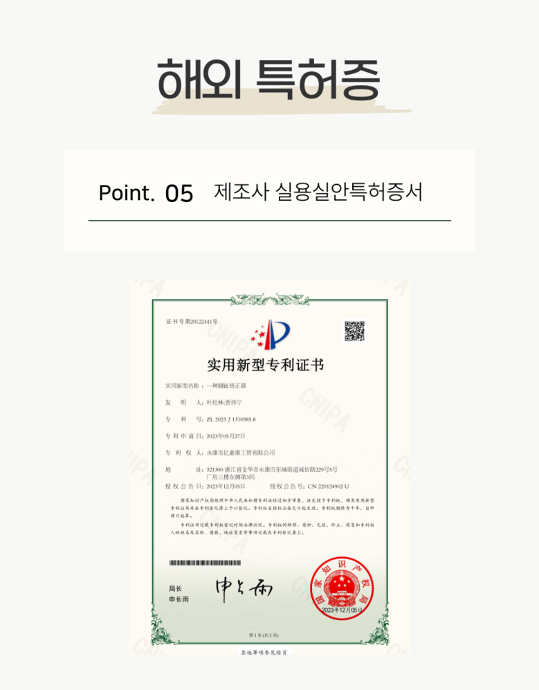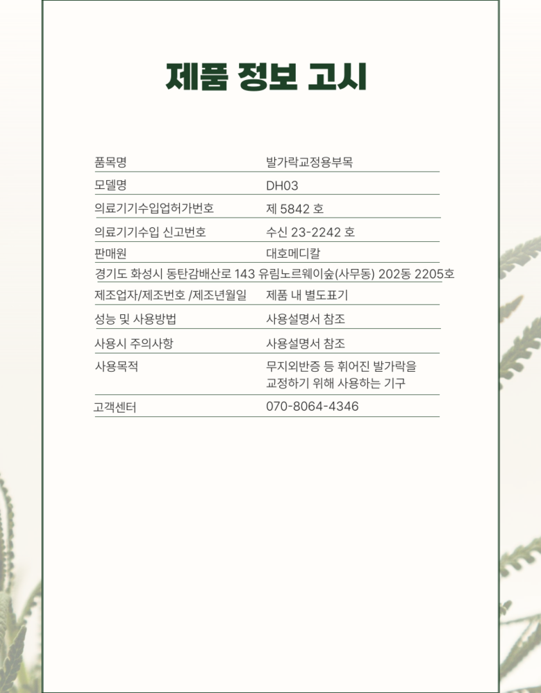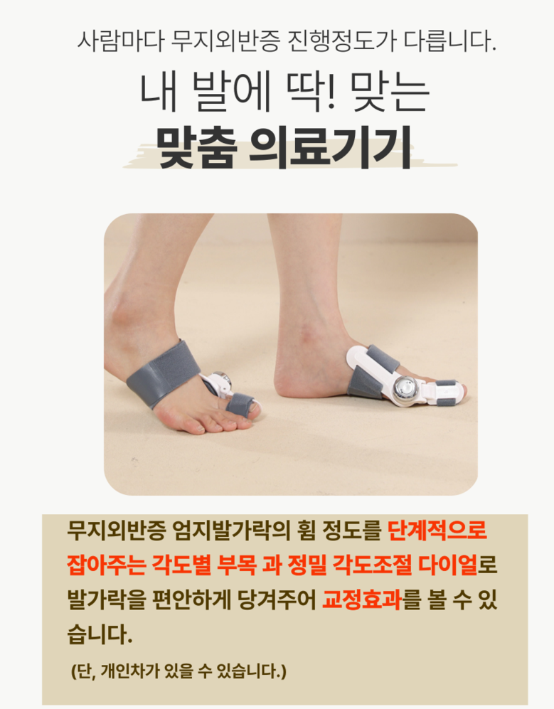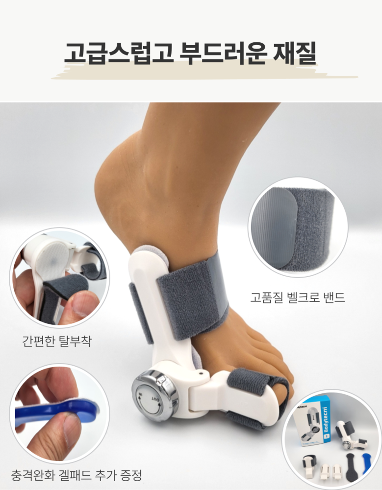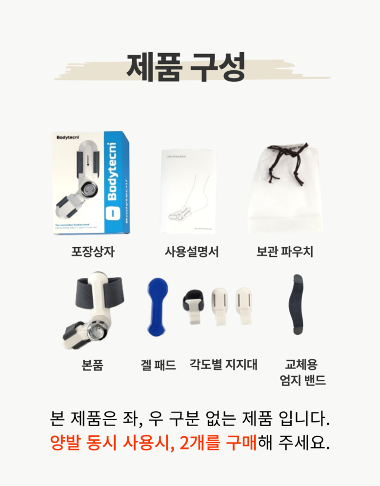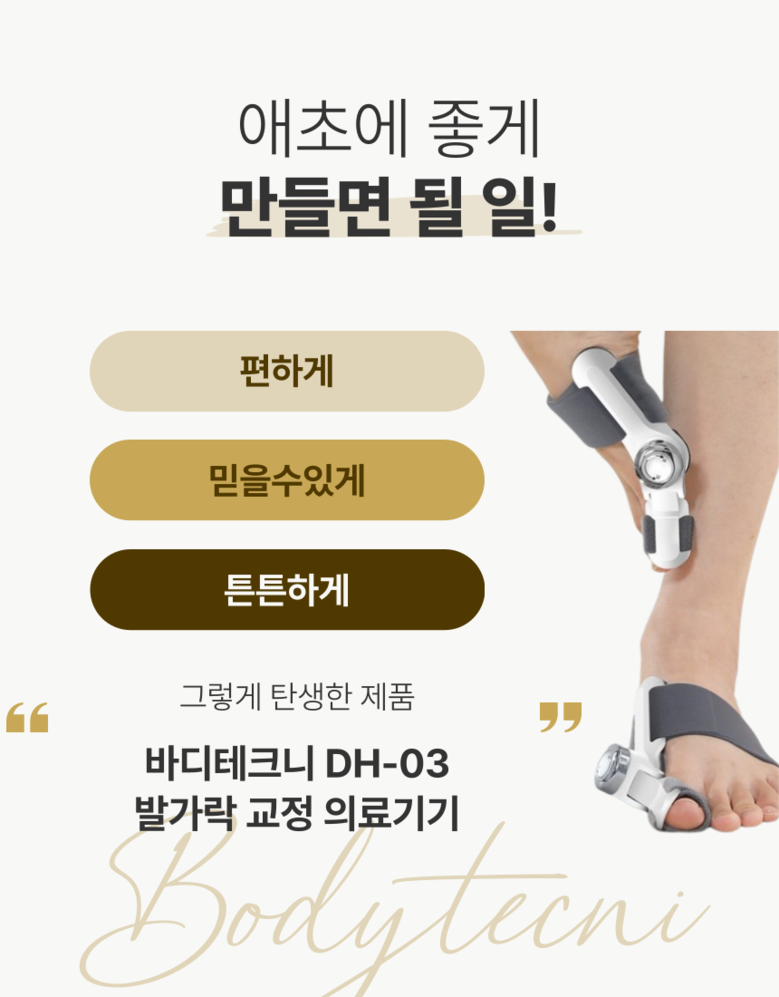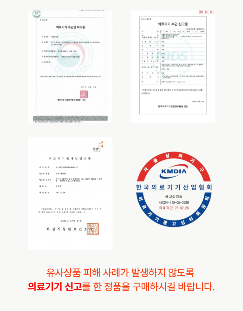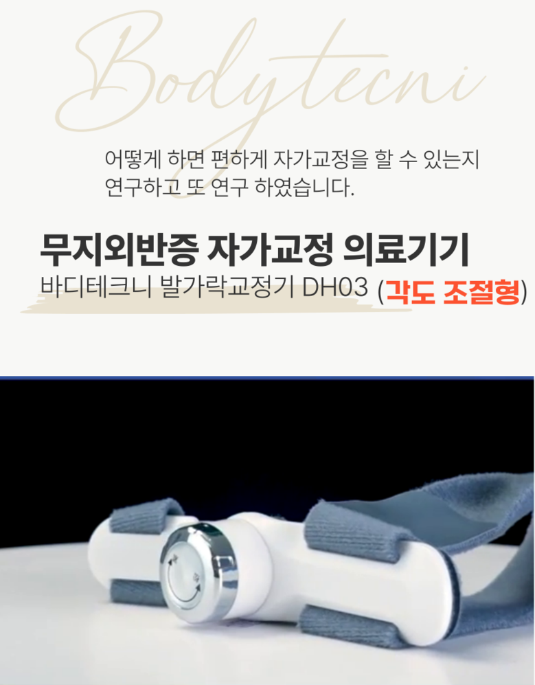 | 품명 및 모델명 | 바디테크니 무지외반증 발가락 교정기 | 허가∙인증∙신고번호 (의료기기법에 따른 허가∙인증∙신고 대상 의료기기에 한함) | 수신24-69호 |