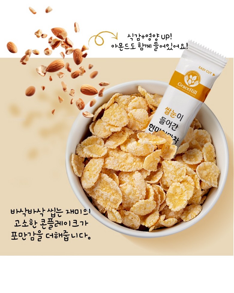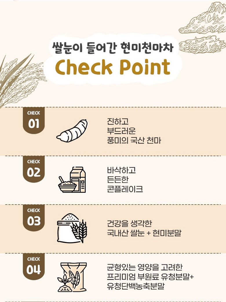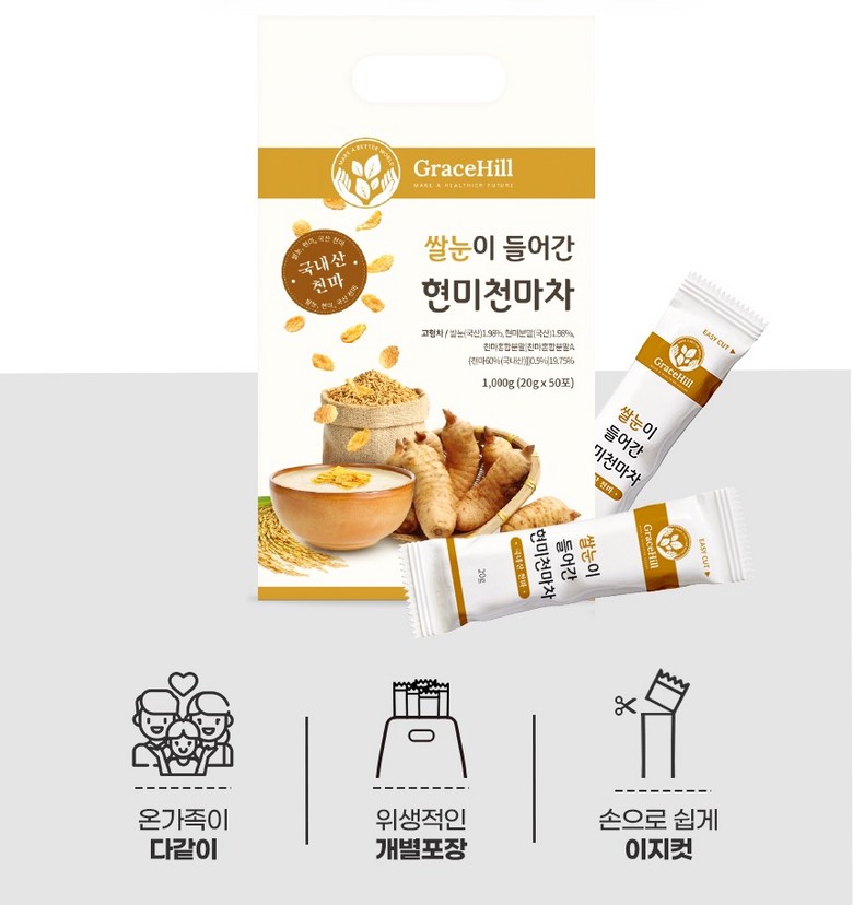 | 포장단위별 내용물의 용량(중량), 수량 | 1,000g(20gX50포) | 원재료명 및 함량 | 쌀눈,현미분말,식물성크림[물엿,식물성유지(팜유:말레이시아산),유청분말(외국산:체코,칠레,프랑스등),유청단백농축분말,제이인산칼륨],천마혼합분말[식물성크림(팜유:말레이시아산),설탕,알파콘씨{옥수수(외국산:호주,프랑스,인도등)},알파콘,덱스트린,천마혼합분말A{천마(국내산),마,}],설탕,알파미분(외국산),알파옥수수전분,알퍄옥수수분말,시리얼,아몬드분태,정제소금 |