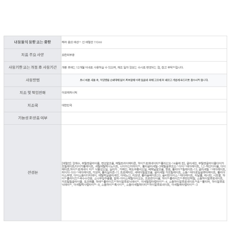 | 화장품제조업자, 화장품책임판매업자 및 맞춤형화장품판매업자 | 상품 상세페이지 참조 | 제조국 | 상품 상세페이지 참조 |