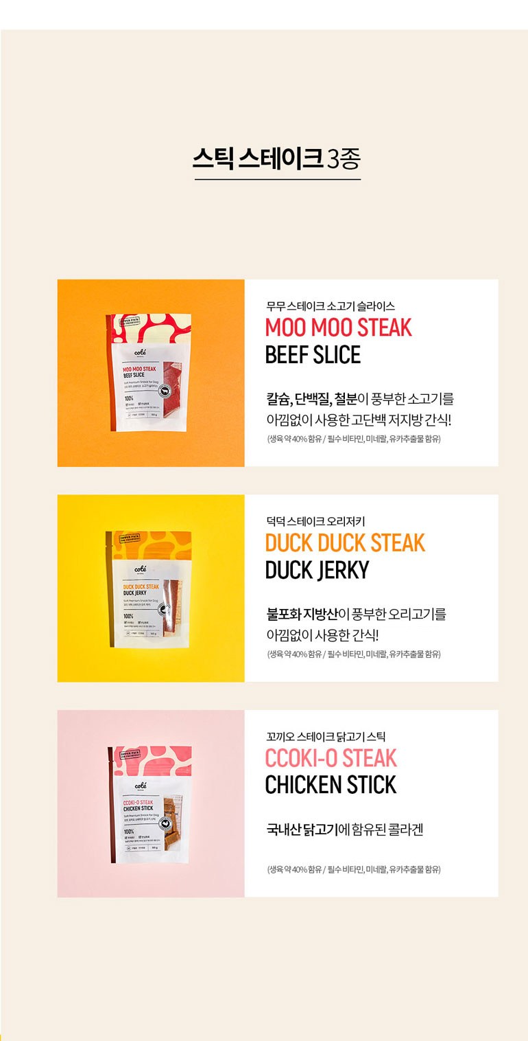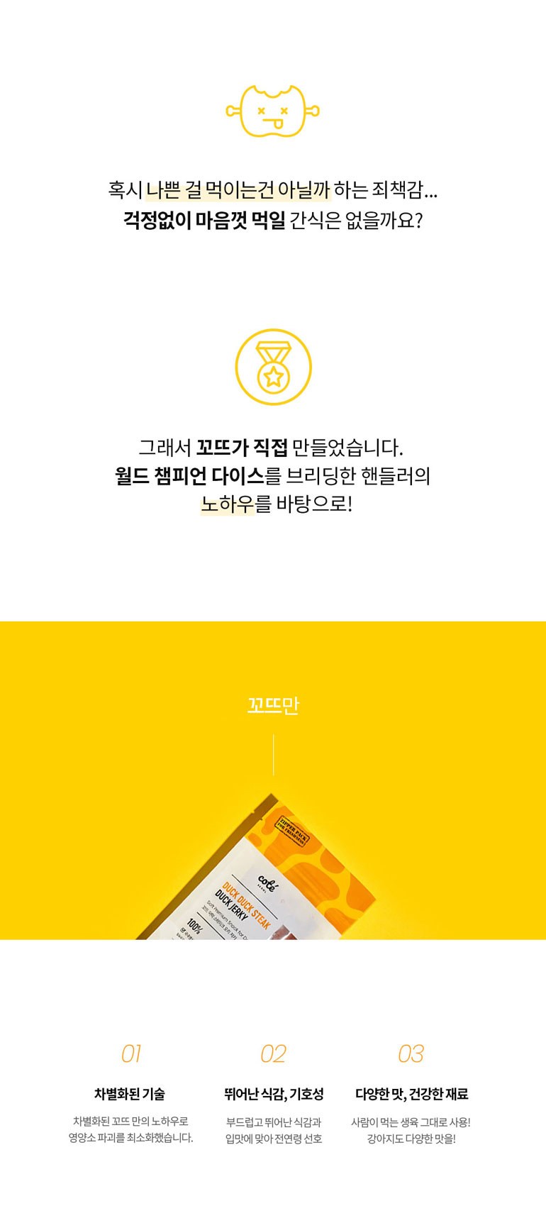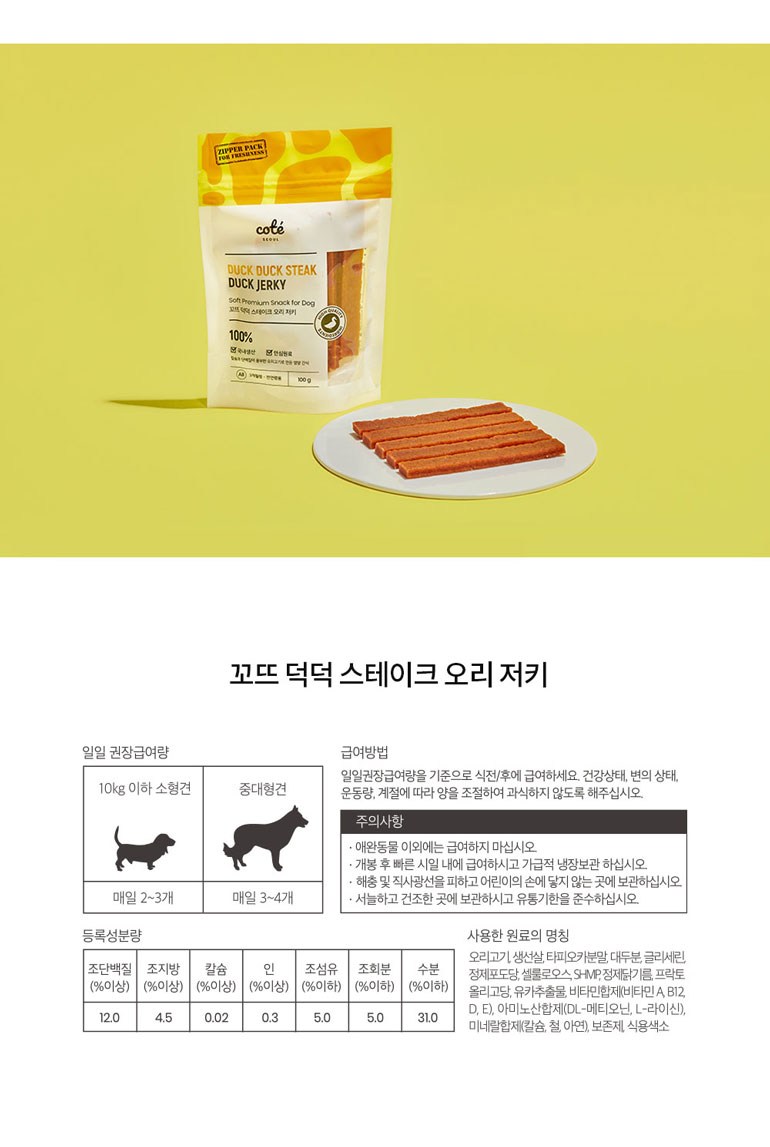 | 품명 및 모델명 | 꼬뜨 덕덕 스테이크 오리저키 | 인증/허가 사항 | 사료관리법에 따른 성분등록번호 : 컨텐츠 참조 |