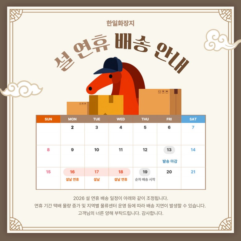 | 배송기간 | ㆍ도서산간 지역 등은 배송에 3-5일이 더 소요될 수 있습니다. - 천재지변, 물량 수급 변동 등 예외적인 사유 발생 시, 다소 지연될 수 있는 점 양해 부탁드립니다. | ||