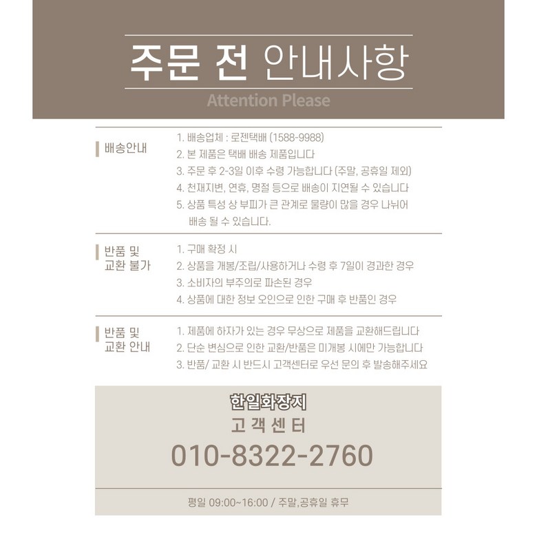 - ㆍ모니터 해상도의 차이로 인해 색상이나 이미지가 실제와 달라, 고객이 단순 변심으로 교환/반품을 무료로 요청하는 경우