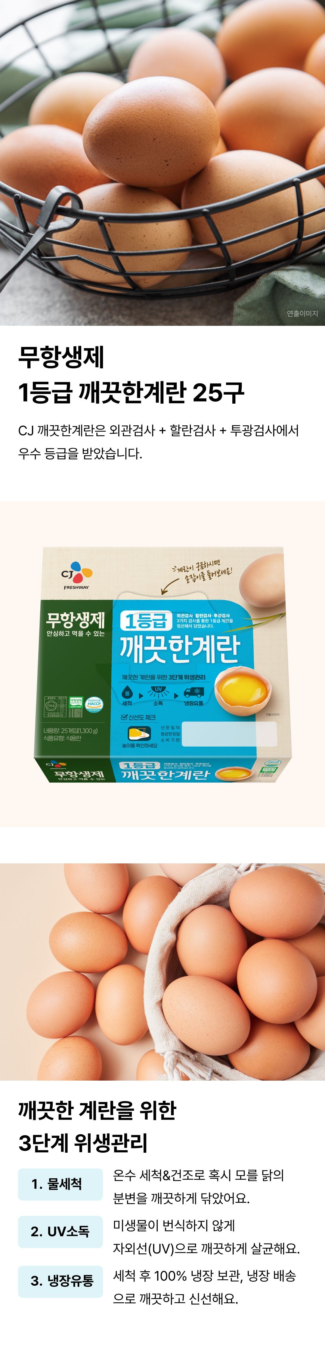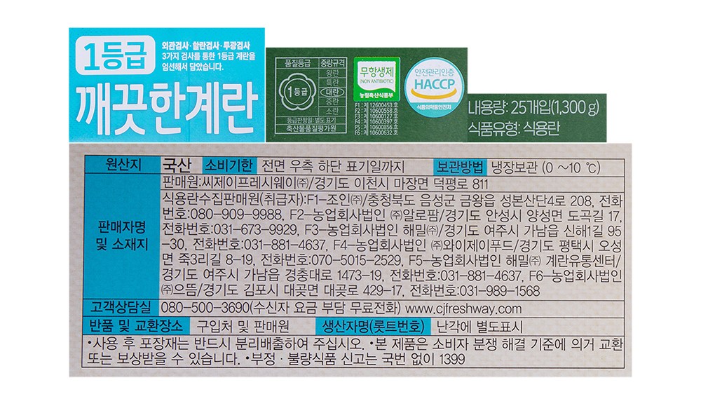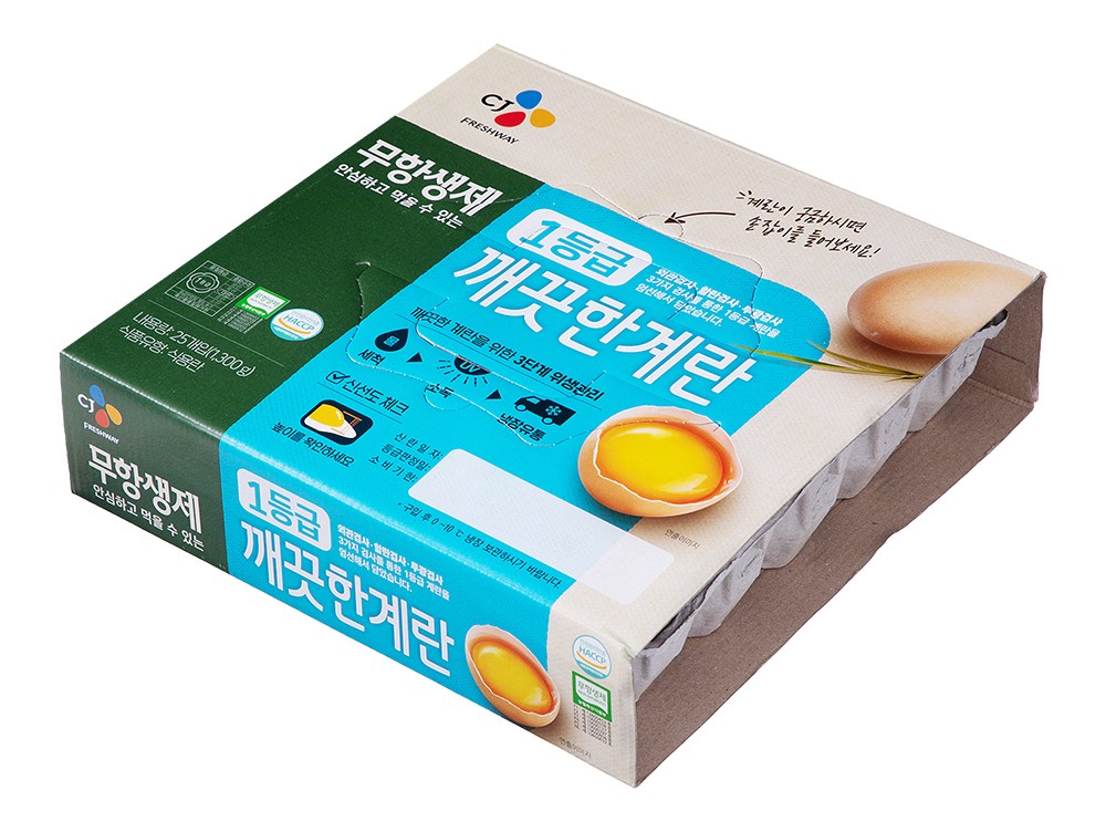 | 품목 또는 명칭 | 무항생제 1등급 깨끗한 계란 | 포장단위별 내용물의 용량(중량),수량,크기 | 1.3kg(25개입) x 2개 |