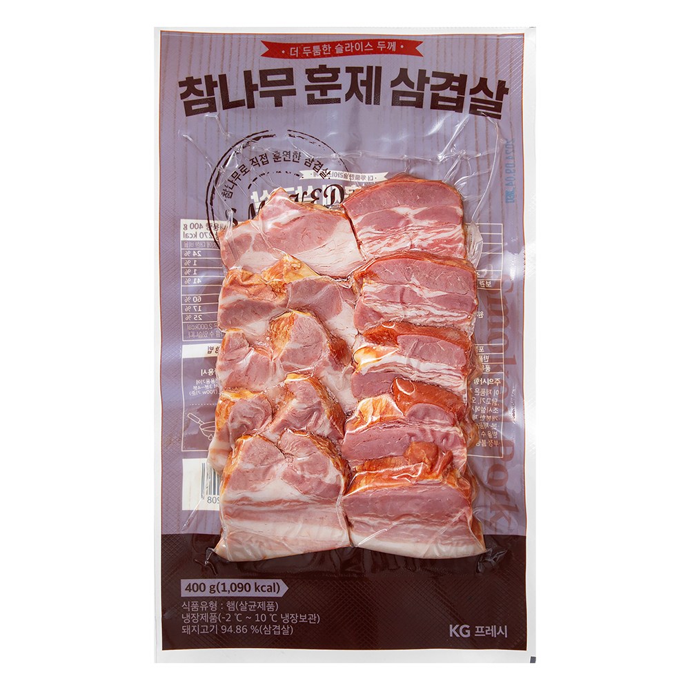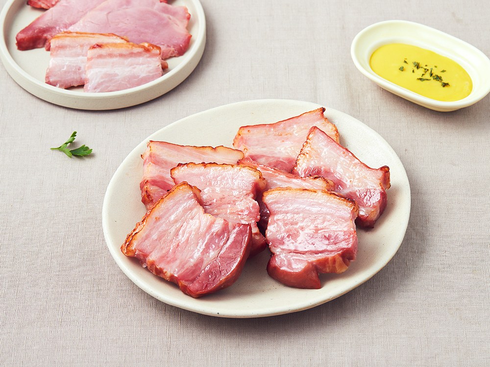 도톰하게 슬라이스 된 참나무 훈제 삼겹살이에요. 향긋한 내음과 고소한 풍미가 매력적이랍니다. 촉촉하고 야들야들한 식감도 빼놓을 수 없지요. 전자레인지 등으로 조리해 식탁 위를 맛있게 채워보세요.