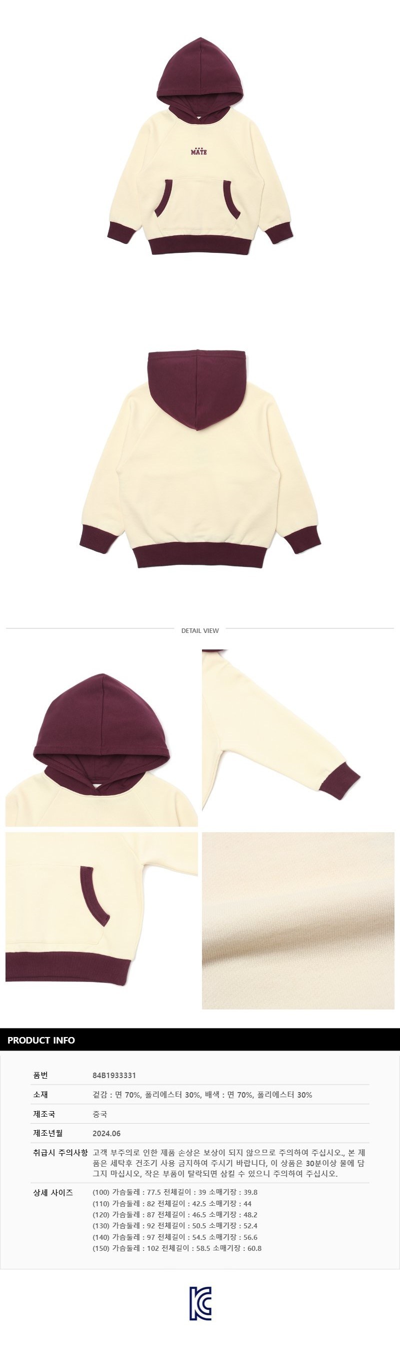 | 품명 및 모델명 | 래핑차일드 컬러 배색 후드맨투맨 BEIGE 110 | KC 인증정보 | 유/KC마크 |