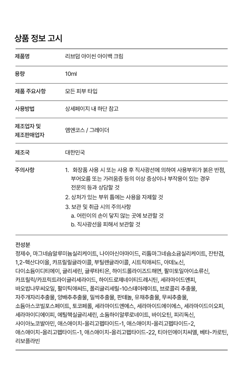 | 품명 및 모델명 | 리브덤 아이씬 아이백 크림 | 인증/허가 사항 | 상품 상세페이지 참조 |