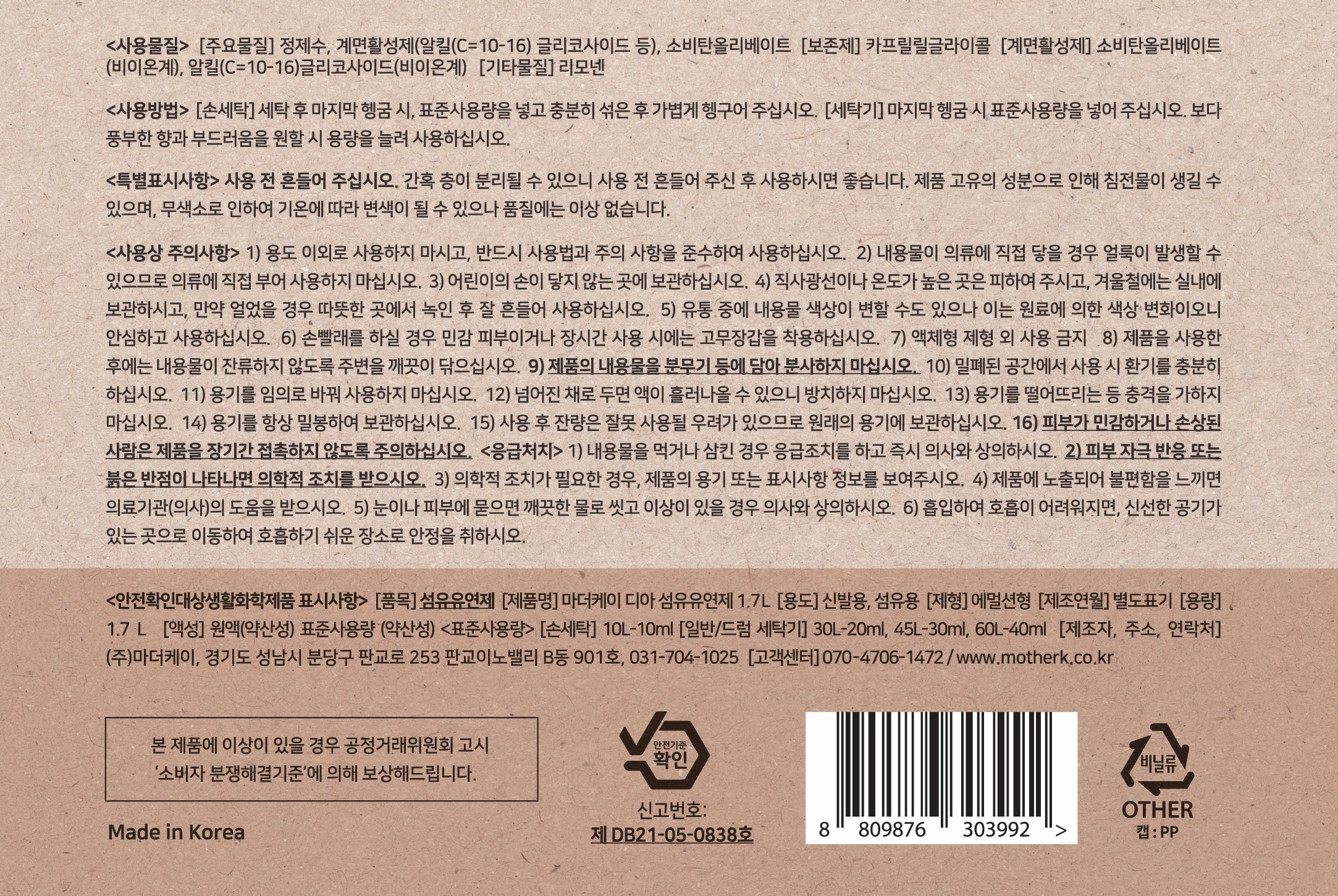 | 품목 및 제품명 | 섬유유연제 / 마더케이 디아 섬유유연제 1.7L | 용도(표백제의 경우 계열을 함께표시) 및 제형 | 신발용,섬유용/에멀션형 |