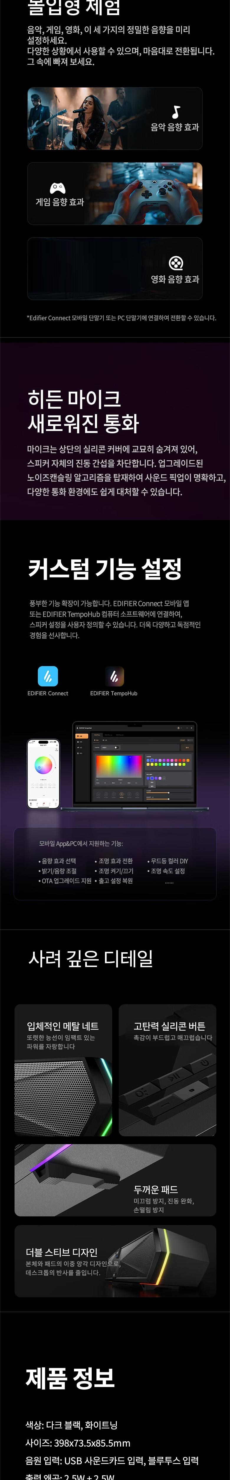 APP 및 PC에서 개별적으로 설정 가능한 분위기 조명 효과를 지원하고 노이즈 캔슬링 마이크가 내장되어 있으며 전문적인 튜닝으로 생생하고 감미로운 음질을 제공합니다.