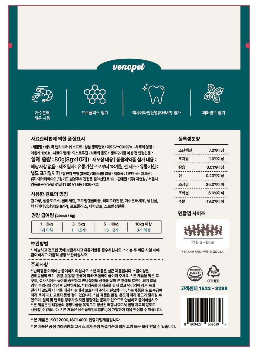 | 품명 및 모델명 | 베노독 덴티 브러쉬 소프트 | 인증/허가 사항 | 사료관리법에 따른 성분등록번호 : 컨텐츠 참조 |