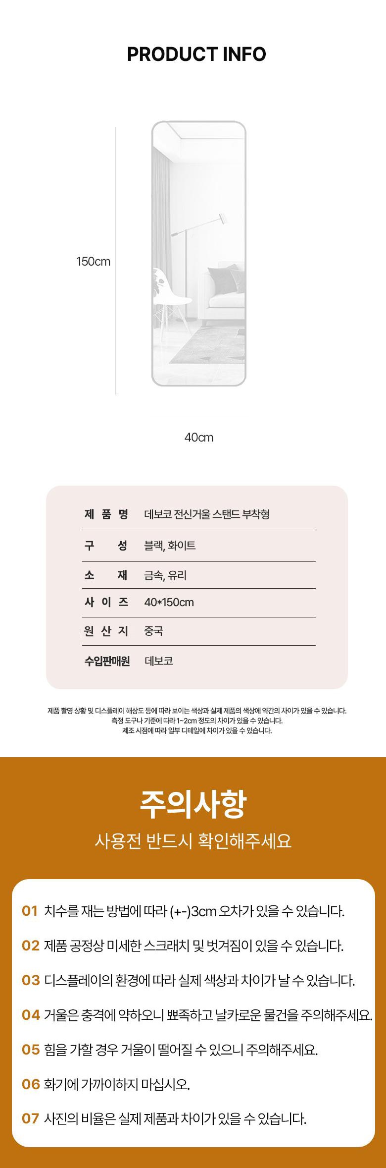 | 품명 및 모델명 | 데보코 전신거울 스탠드 부착형 | 인증/허가 사항 | 해당없음 |