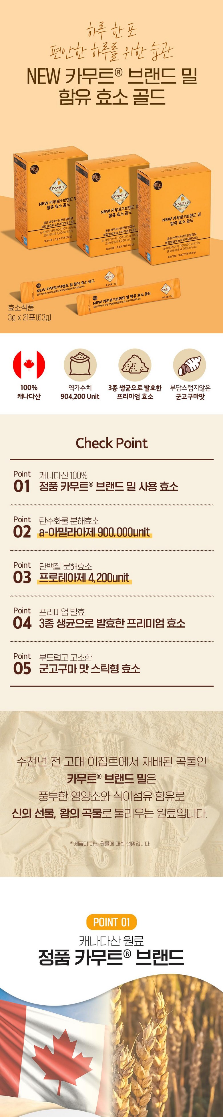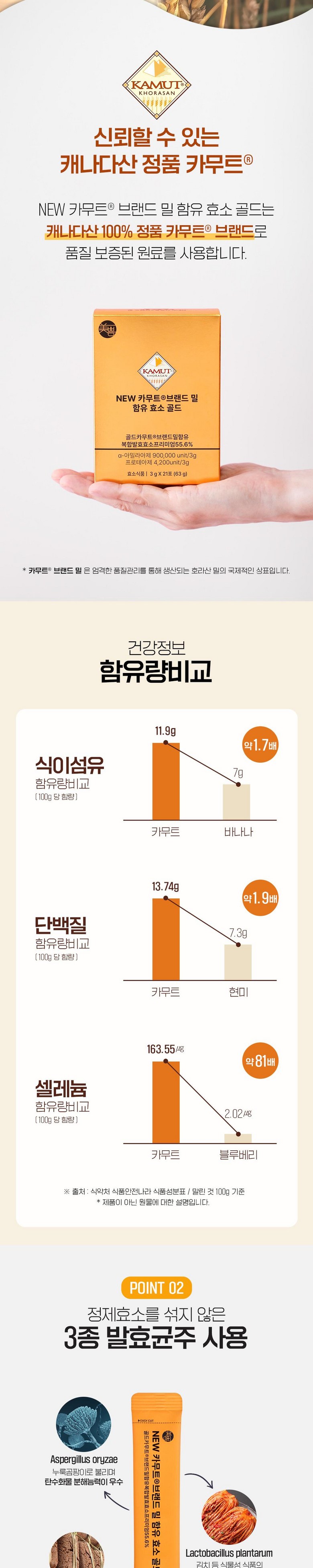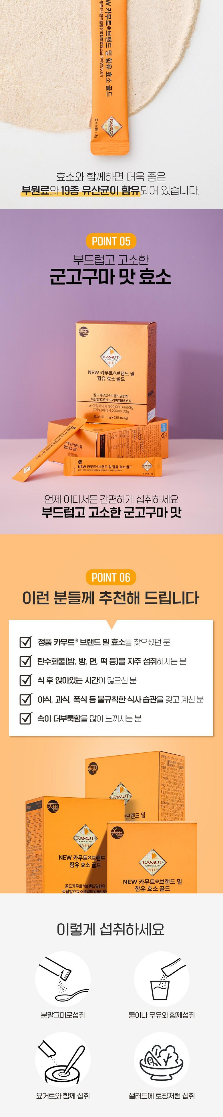 | 원재료명 및 함량 | [원료명 및 함량] 골드카무트®브랜드밀함유복합발효효소프리미엄[카무트®브랜드밀함유N자임A{카무트®브랜드호라산밀(밀:캐나다산)}, 카무트®브랜드밀함유N자임LF{카무트®브랜드호라산밀(밀:캐나다산)}, 카무트®브랜드밀N자임B], 고구마엑기스분말{고구마농축액(고구마:국산), 혼합제제(주정, 정제수, 프로필렌글리콜, 향료), 치자황색소}, 식물성크림분말{올리고당, 식물성경화유지(팜핵유: 인도네시아산), 농축우유단백분말(뉴질랜드산), 제이인산칼륨, 구연산칼륨}, 무수결정포도당, 고구마향분말(덱스트린, 향료, 아라비아검), 분리대두단백(분리대두단백, 레시틴), 이산화규소, 프락토올리고당, 검은콩분말,효소처리스테비아, 난소화성말토덱스트린, 세븐베리농축분말, 유기농과일야채혼합분말, 유기농베리혼합분말, 자일리톨, 치커리뿌리추출물, 수크랄로스(감미료), 19종혼합유산균, 유기농 원료 총 함량: 0.121% 밀, 우유, 대두, 복숭아 함유 | 영양성분 | 상품 상세페이지 참조 |