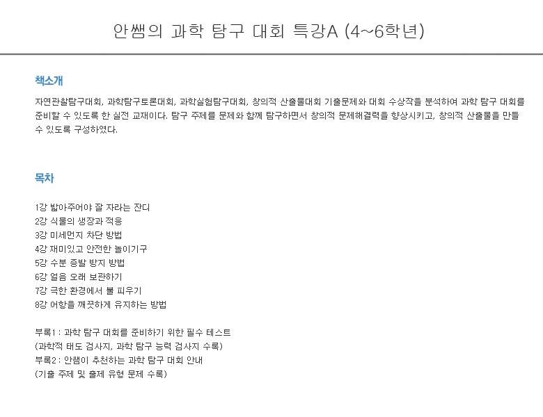 | 도서명 | [매스티안] 안쌤의 과학 탐구 대회 특강A (4~6학년) | 저자, 출판사 | 안쌤 영재교육연구소 / 매스티안 |