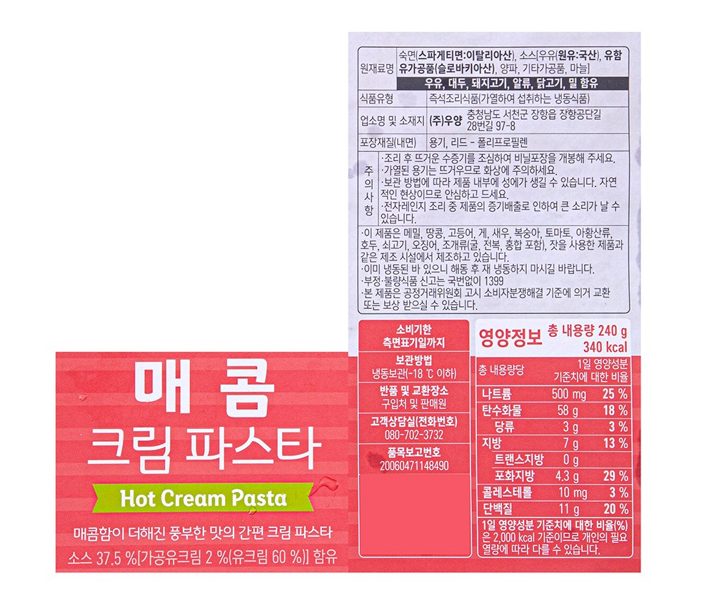 | 제품명 | 쉐프스토리 매콤크림파스타 | 식품의 유형 | 컨텐츠 참조 |