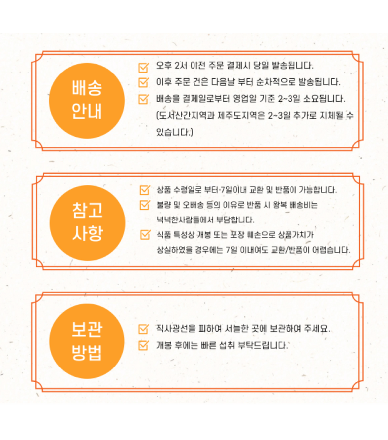 | 배송방법 | 순차배송 | 배송비 | 무료배송 - 도서산간 지역 배송불가 |