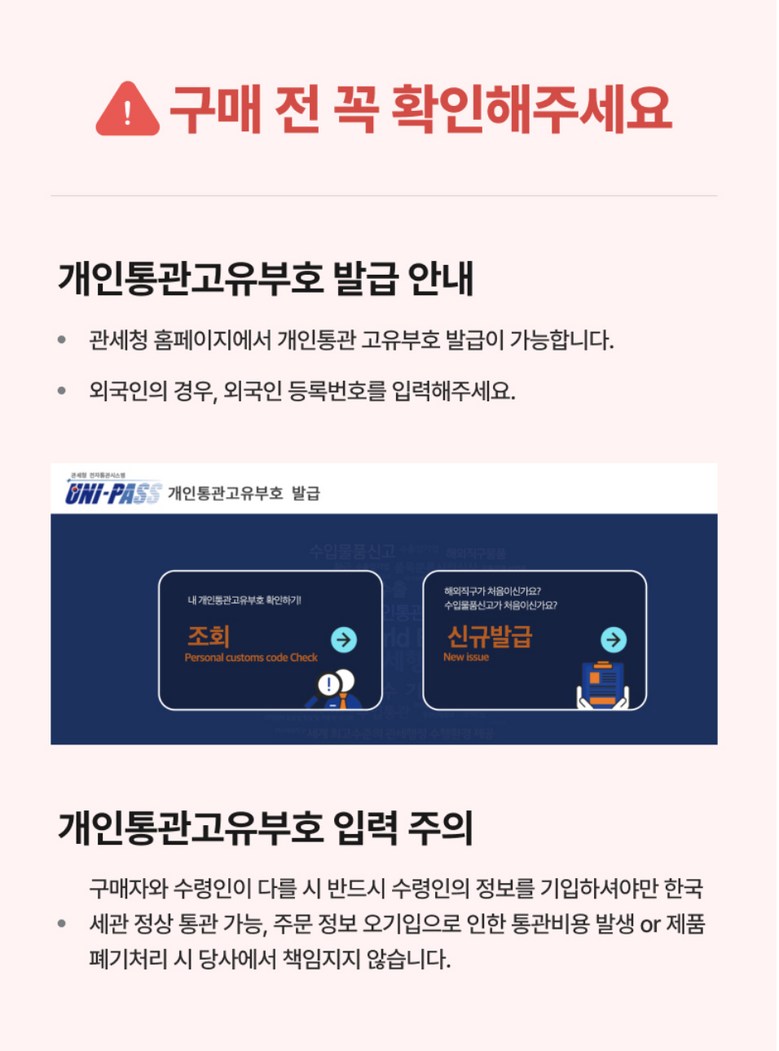 - 법규 개정에 따라 개인통관고유부호 검증 절차가 강화되었습니다. 결제 단계에서 받는 사람의 정보가 관세청 등록 정보 (성명, 휴대폰, 개인통관고유부호, 주소) 와 일치하는지 확인해주세요.