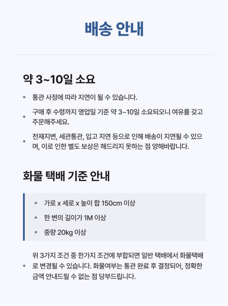 - 주문일 기준 동일 판매자 총 구매 금액이 면세 한도 초과 시 관부가세가 부과될 수 있습니다