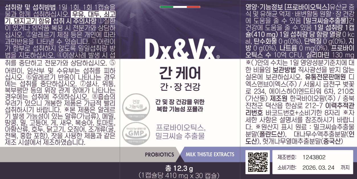 | 소비기한 및 보관방법 | 소비기한(또는 유통기한) : 2026년 08월 23일 이거나 그 이후인 상품 제조년월일 : 2024년 11월 24일 이후인 제조상품 보관방법: 컨텐츠 참조 | 포장단위별 내용물의 용량(중량), 수량 | 30정 x 3개 |