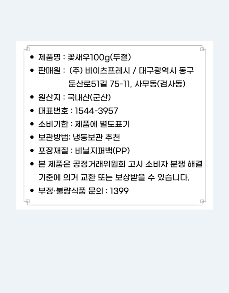 상호/대표자 | 주식회사 비이츠프레시 / 김복희 | 사업장 소재지 | 대구광역시 동구 둔산로51길 75-11 사무동(검사동) |