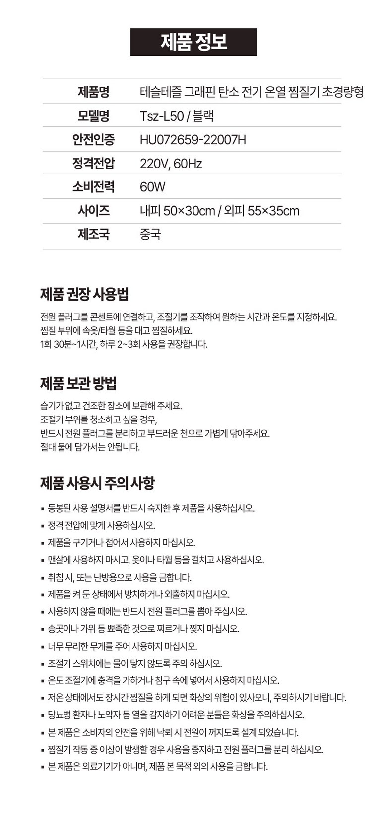 | 품명 및 모델명 | 테슬테즐 그래핀 탄소 초경량 전기 온열 찜질기 | KC 인증정보 | HU072659-22007H |