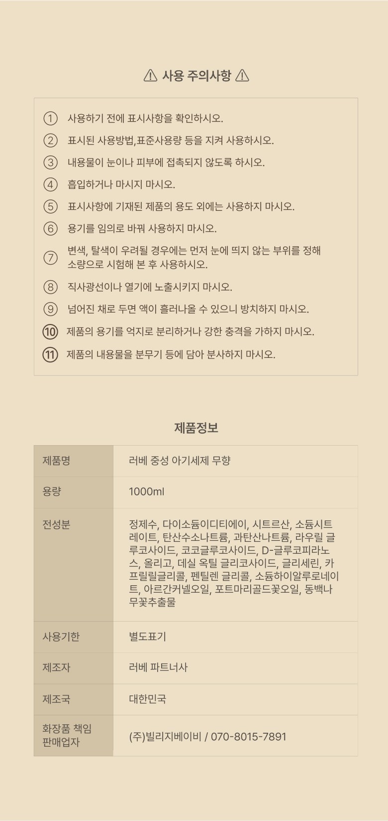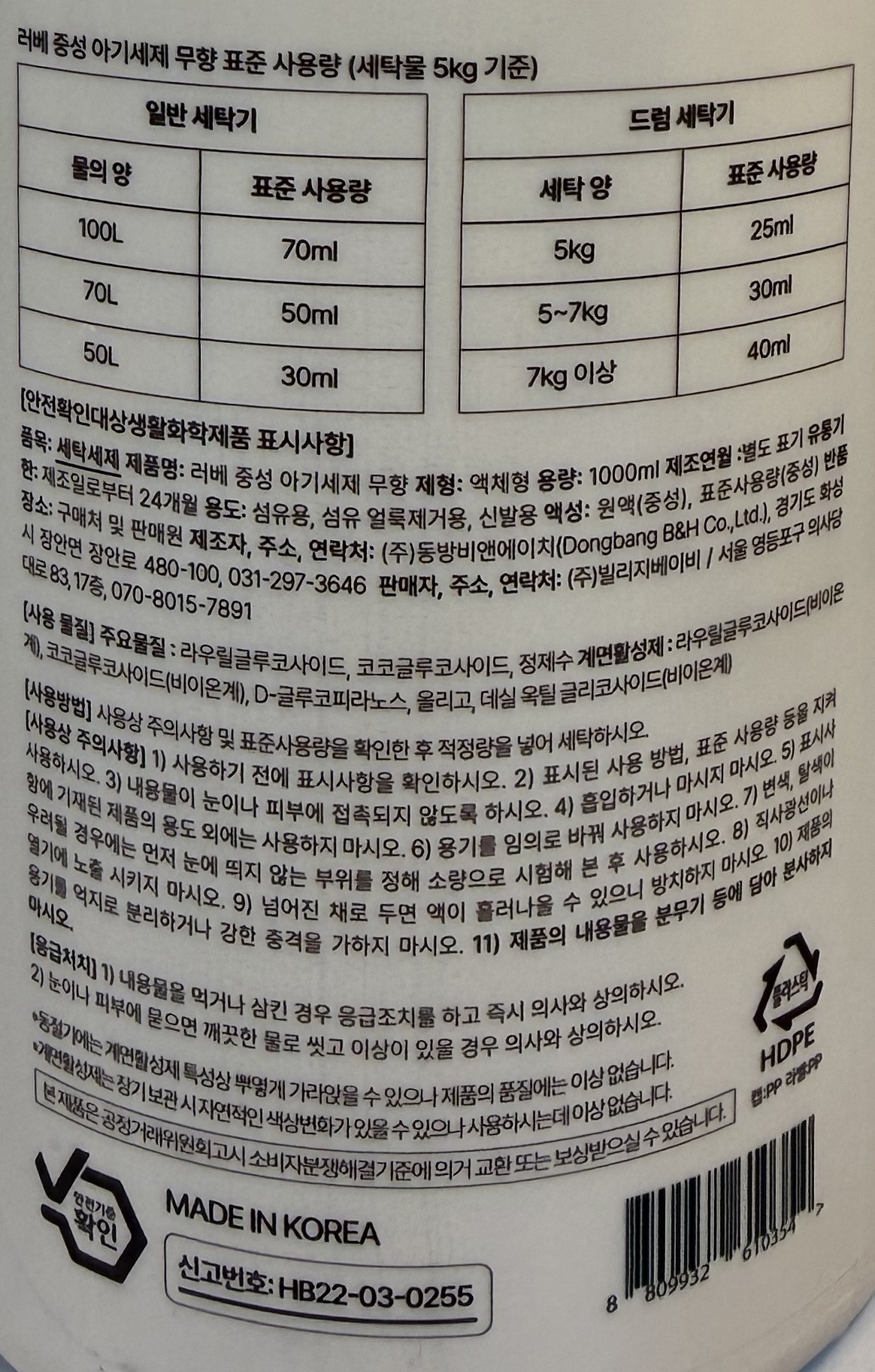 | 품목 및 제품명 | 세탁세제 / 러베 중성 아기세제 무향 | 용도(표백제의 경우 계열을 함께표시) 및 제형 | 섬유용, 섬유 얼룩제거용, 신발용 / 액체형 |