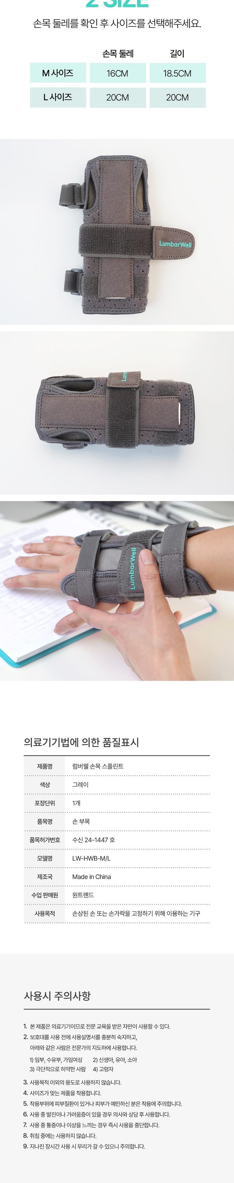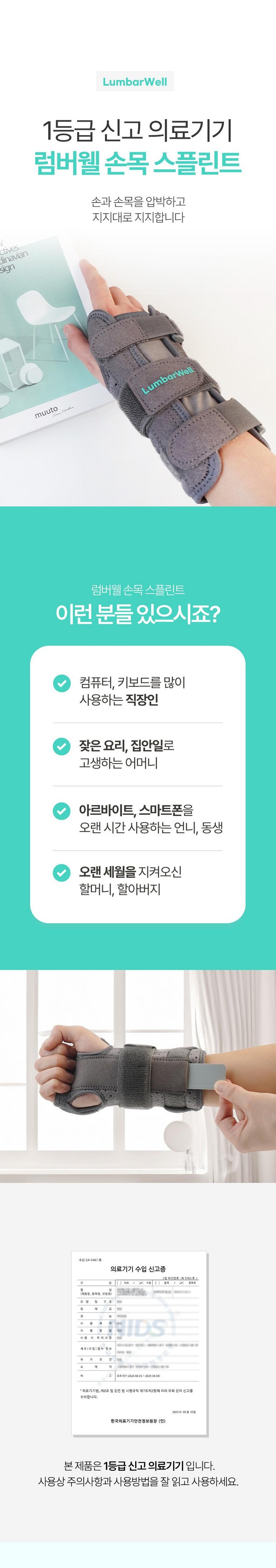 | 품명 및 모델명 | 럼버웰 손목 보호대 스플린트 지지대 | 허가∙인증∙신고번호 (의료기기법에 따른 허가∙인증∙신고 대상 의료기기에 한함) | 수신 24 - 1447 호 |