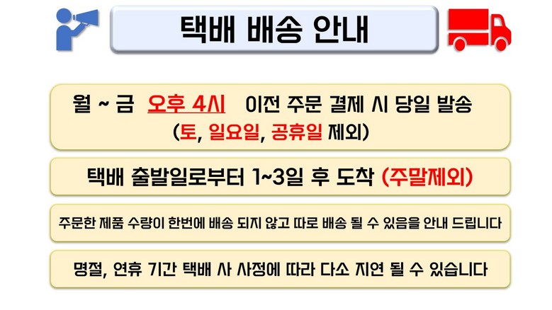 | 배송기간 | ㆍ도서산간 지역 등은 배송에 3-5일이 더 소요될 수 있습니다. - 천재지변, 물량 수급 변동 등 예외적인 사유 발생 시, 다소 지연될 수 있는 점 양해 부탁드립니다. | ||