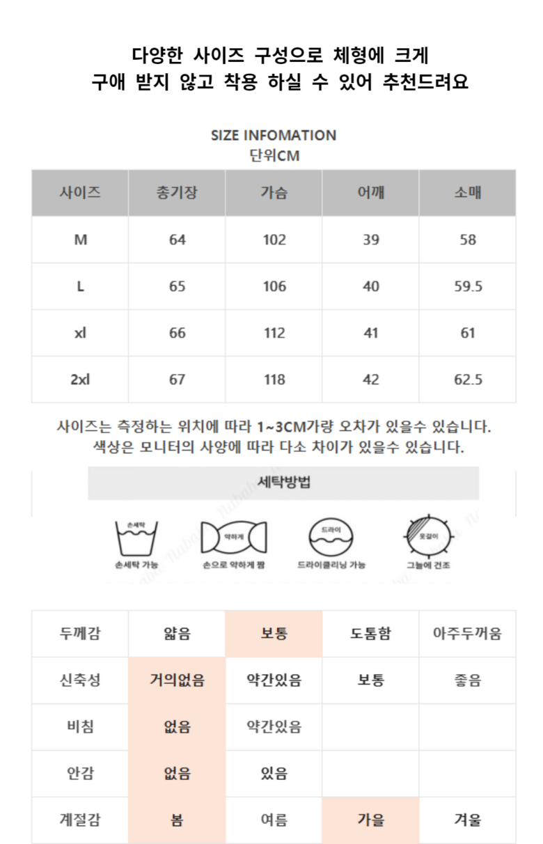 | 제조국 | 중국 | 세탁방법 및 취급시 주의사항 | 상품 상세페이지 참조 |