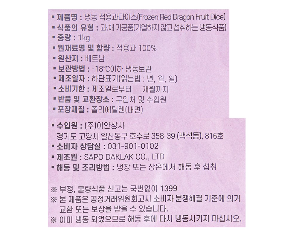 달콤한 맛이 진한 적용과. 맛있지만 껍질을 벗겨내는 게 번거로우셨다면, 적용과 다이스를 만나보세요. 작은 크기로 썰려 있어 손쉽게 활용할 수 있답니다. 톡톡 터지는 씨앗의 식감은 그대로 살아있어요. 그대로 시원하게 드셔도 좋고, 요거트에 얹어 산뜻하게 즐기셔도 좋아요.