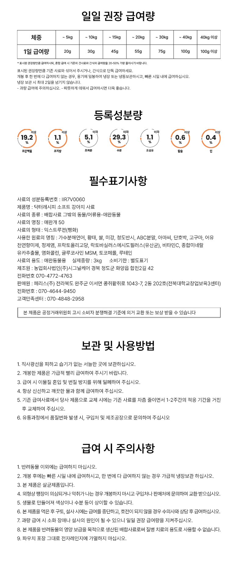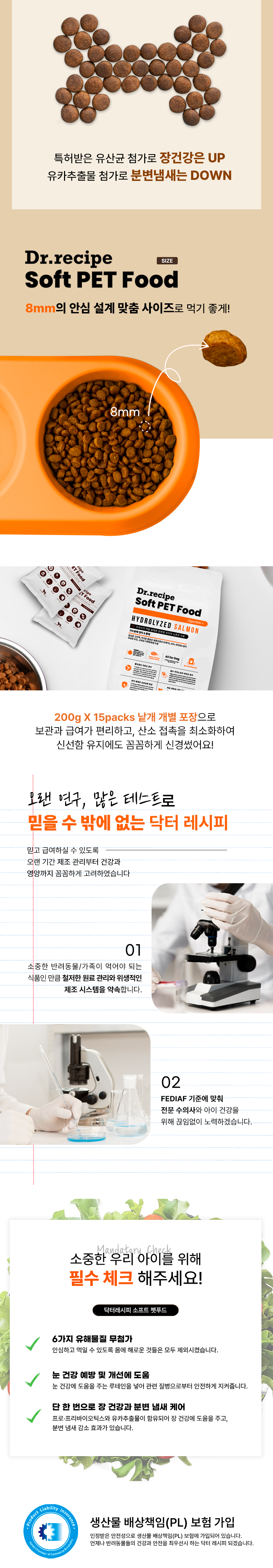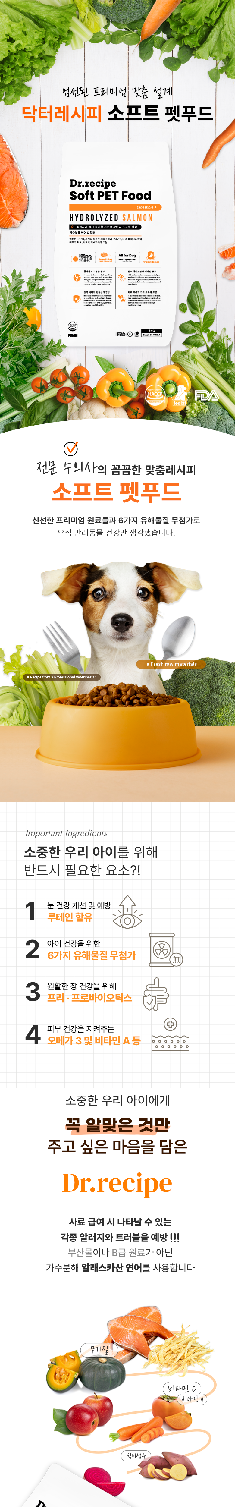 | 품명 및 모델명 | 닥터레시피 소프트 강아지 사료 | 인증/허가 사항 | FDA 인증, FEDIAF 인증, ISO9001 인증, ISO14001 인증, HACCP 인증 |