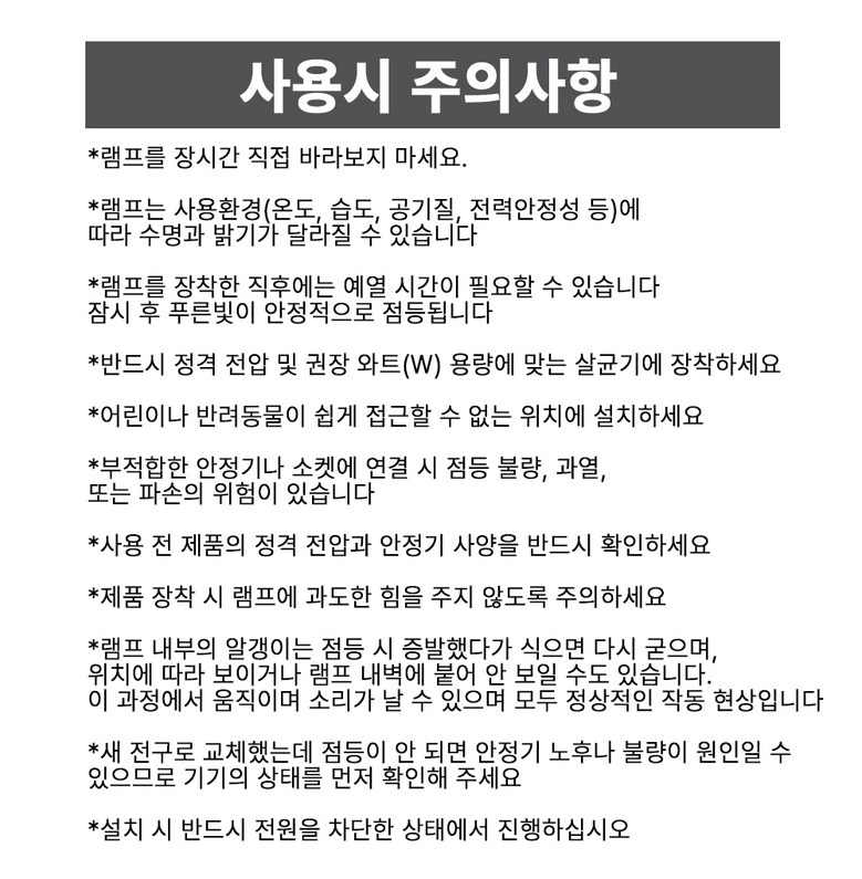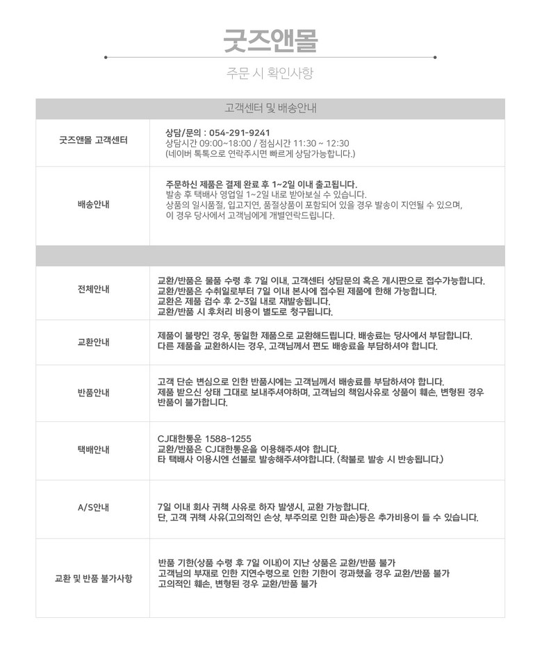 - ㆍ교환/반품에 관한 일반적인 사항은 판매자가 제시사항보다 관계법령이 우선합니다.